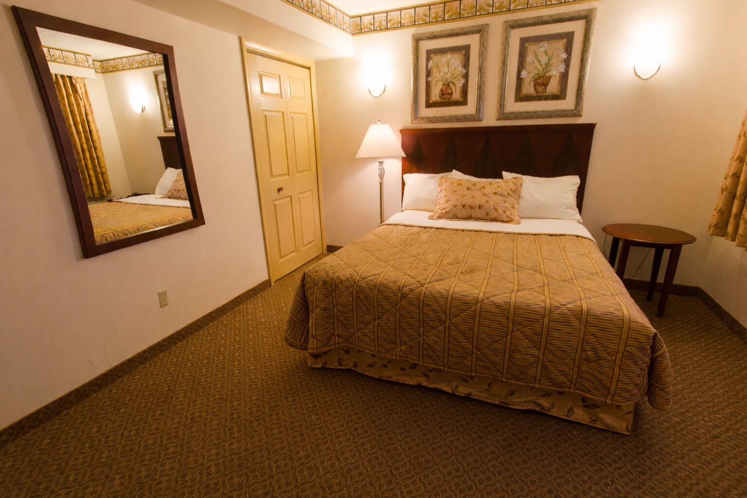 ne bedroom, separate living room, and kitchen. The bedroom has two queen beds and the living room features a pullout double sofa bed.