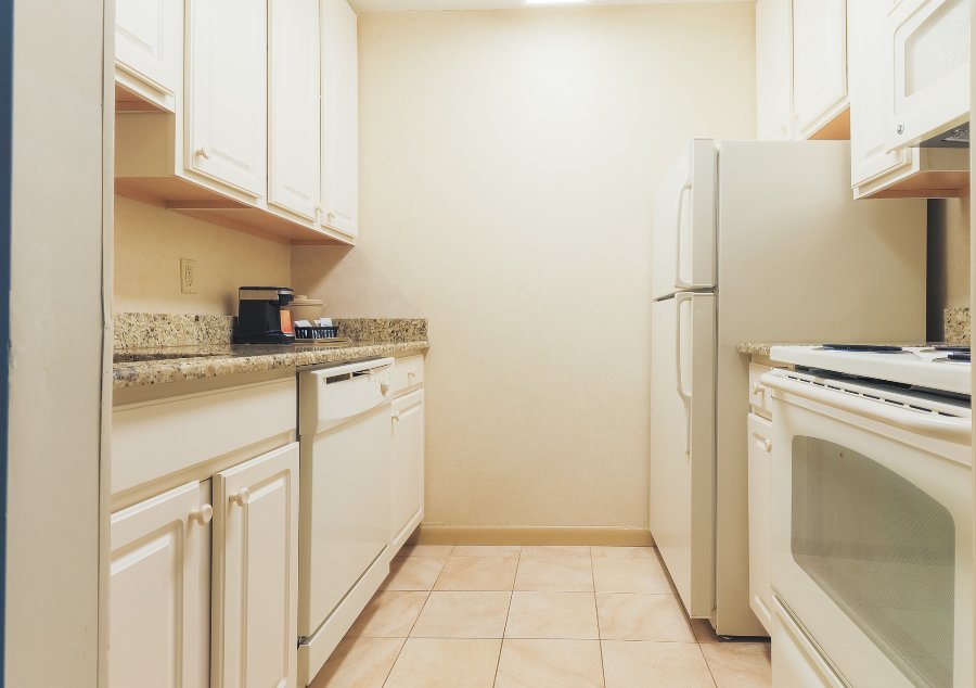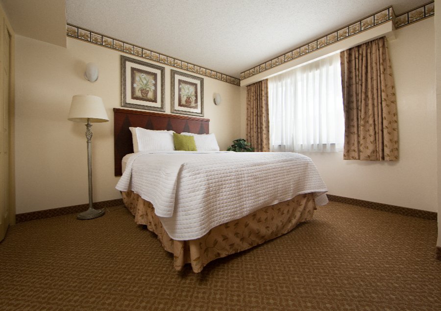 Large suite with separate living room with sofa bed and two bedrooms, one with a king pillow top bed one with a queen pillow top bed full kitchen and bath with walk in shower and a tub. Approximately 760 SQ FT