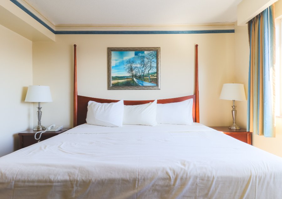 Traditional hotel guest room with two double pillow top beds or two queen pillow top beds & seating area. Approximately 375 SQ FT.