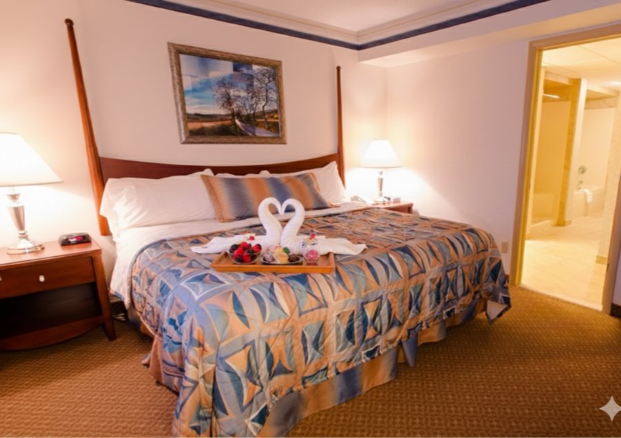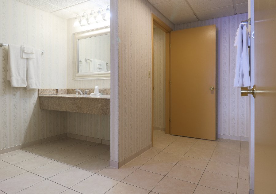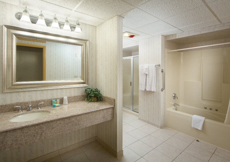 Large suite with separate living room with sofa bed fridge and bedroom with two pillowtop double or queen beds Jacuzzi tub and walk in shower.…
