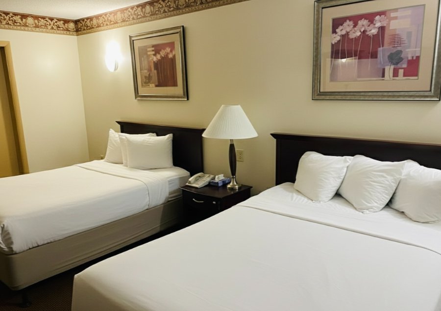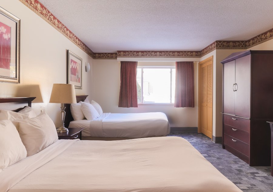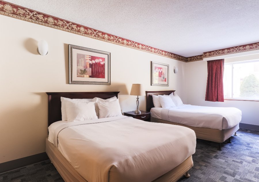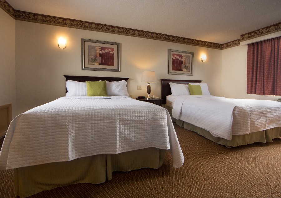 Traditional hotel guest room with two double pillow top beds or two queen pillow top beds & seating area. Approximately 375 SQ FT.